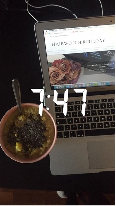 7:47am- After sweaty workout home, good shower and getting ready for my day. I am a big foodie and I love my breakfast (the most important meal of the day!). Right now it is unbelievably cold in Manchester, even though it is spring, so I am still enjoying warm bowls of porridge with poached apple, rice milk , chia seeds and almond butter (completely obsessed!). Of course, breakfast is great time to catch up on my blogging;)